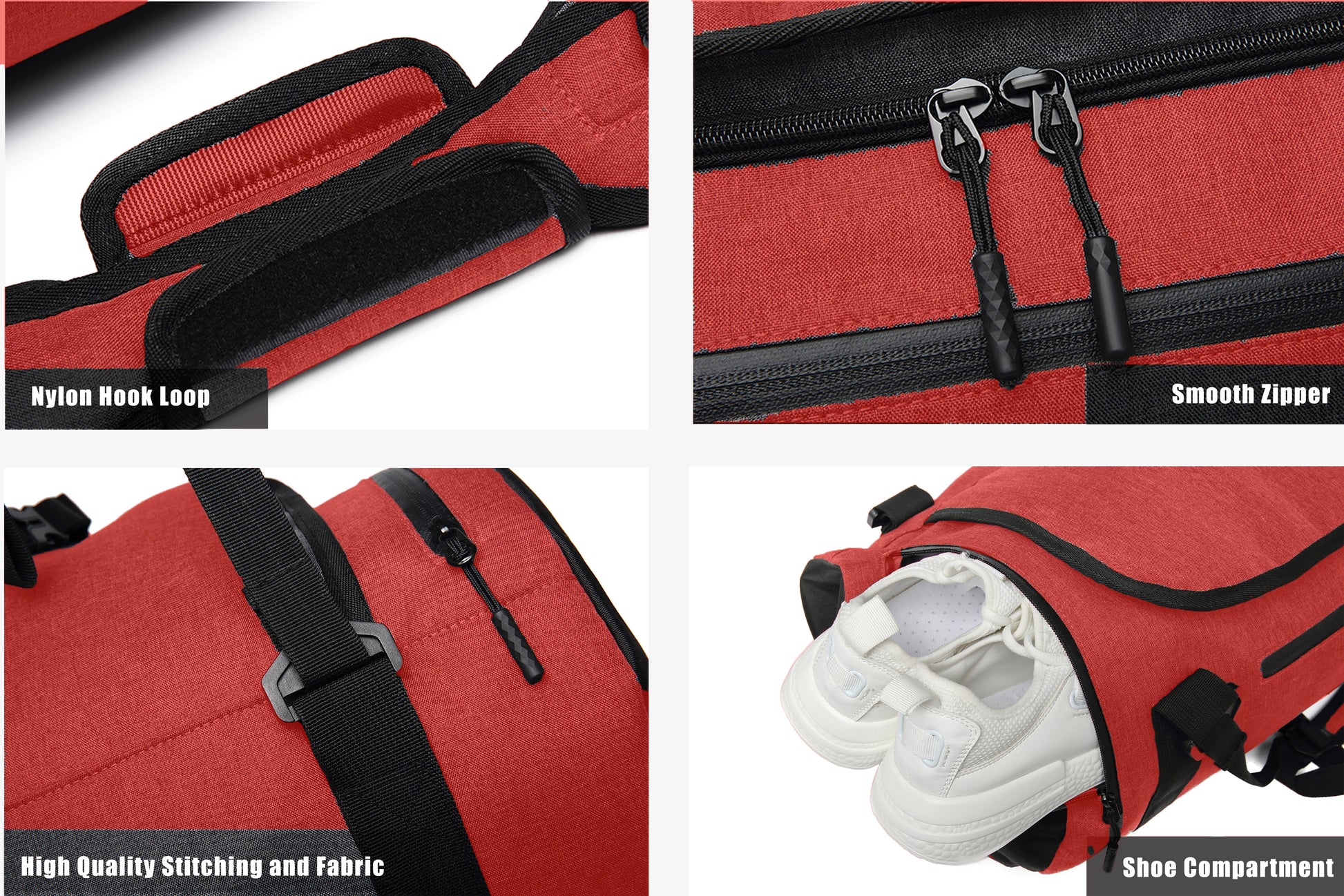 HEAVY-DUTY MATERIALS: This amazing red gym bag is made of polyester. This durable and long-lasting material allows you to carry everything you need without worrying about the weight. The bidirectional zippers are not just practical but also very sturdy. This travel bag is also waterproof and dirt-resistant.